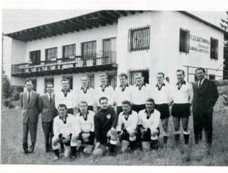 Historische Aufnahme - aus gegebenem Anlass und auf mehrfachen Wunsch jetzt namentlich (von links): Trainer Helmut Haist +, Vorsitzender Albrecht Kaiser +, 7 Lothar Dorer +, 5 Willi Becker +, 10 Horst Herr, 11 Dieter Hörtkorn, 8 Peter Sickinger +, Rudi Fehrenbach (Ersatz), 9 Artur Dold +, Spielausschussvorsitzender Karl Kienzler (David) + ; knieend von links: 6 Manfred Tritschler +, 2 Heiner Hettich +, 1 Herbert Hör +, 3 Günther Pohl +, 4 Anton Kienzler +