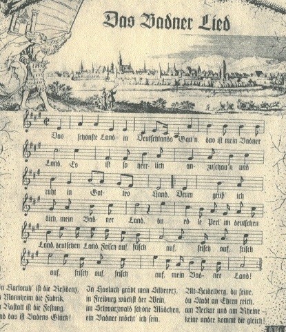 Bei allem badischen Patriotismus möchte ich jedoch nicht vergessen anzumerken, dass auch die Württemberger - "Preisend mit viel schönen Reden ..." - und die Hohenzollern - "Nicht weit von Württemberg und Baden ..." - entsprechend schöne Lieder ("Landeshymnen") ihr Eigen nennen, ganz zu schweigen vom Lied der Bayern:"Gott mit Dir, du Land der Bayern, deutsche Erde, Vaterland ......" Und ganz wunderbar: "Dem Land Tirol die Treue"!